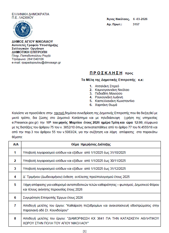 Συνεδρίαση Δημοτικής Επιτροπής Δήμου Αγίου Νικολάου. Παρασκευή 10-03-2026 και ώρα 12:00