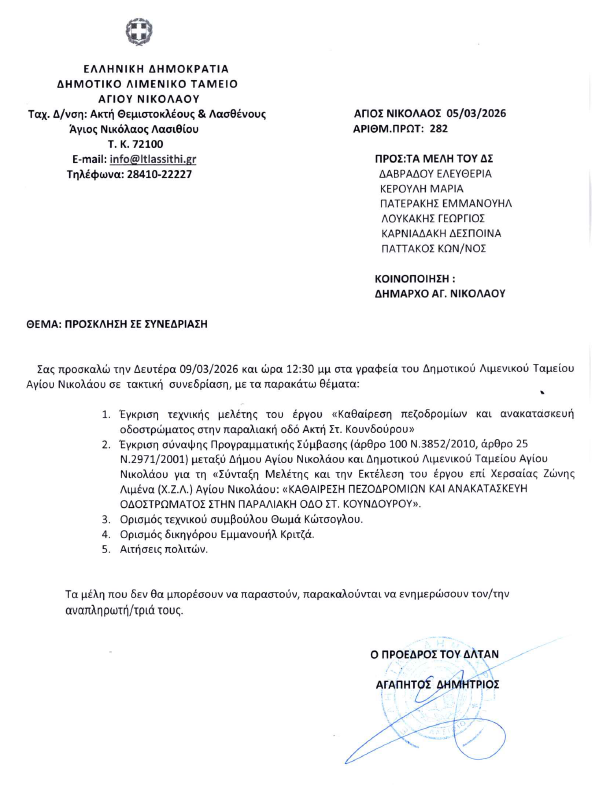 Συνεδρίαση Δημοτικού Λιμενικού Ταμείου Αγίου Nικολάου. Δευτέρα 06-03-2026 και ώρα 12:30 μμ 6 Μαρτίου, 2026