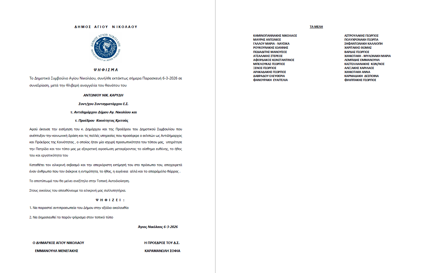 Ψήφισμα του Δημοτικού Συμβουλίου Αγίου Νικολάου για τον θάνατο του Αντωνίου Νικ. Καρύδη 7 Μαρτίου, 2026