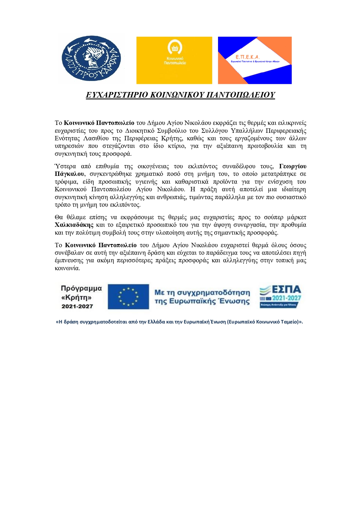 Ευχαριστήριο Κοινωνικού Παντοπωλείου