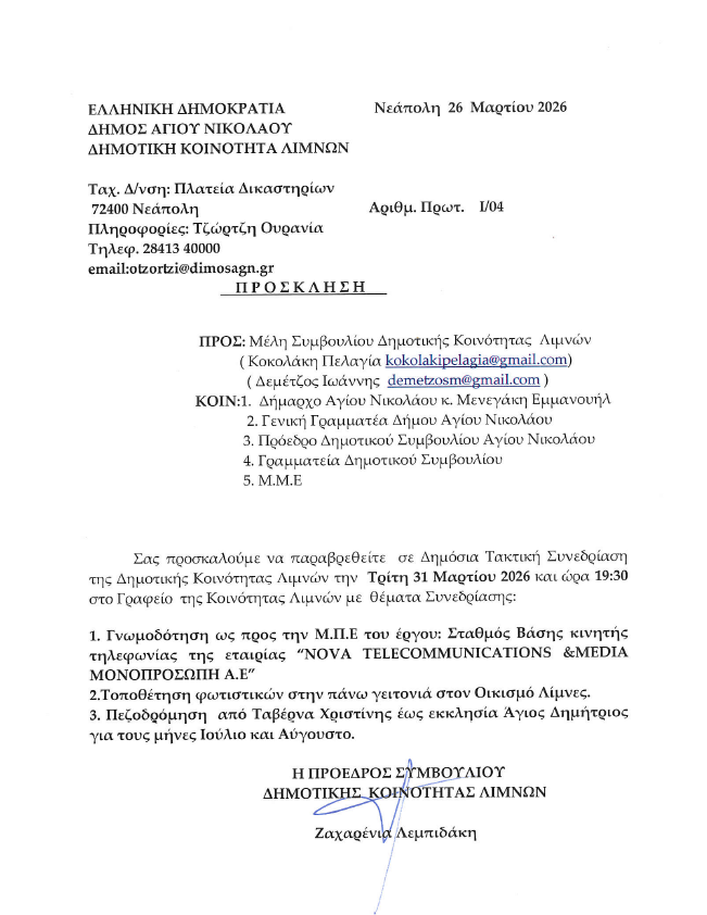 Πρόσκληση Συνεδρίασης Δημοτικής Κοινότητας Λιμνών. Τρίτη 26/03/2026 και ώρα 19:30