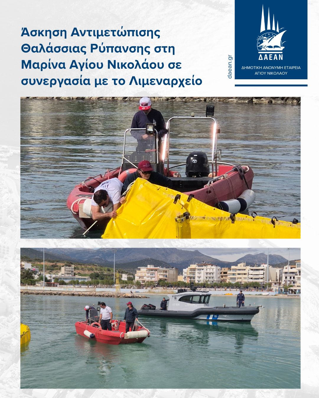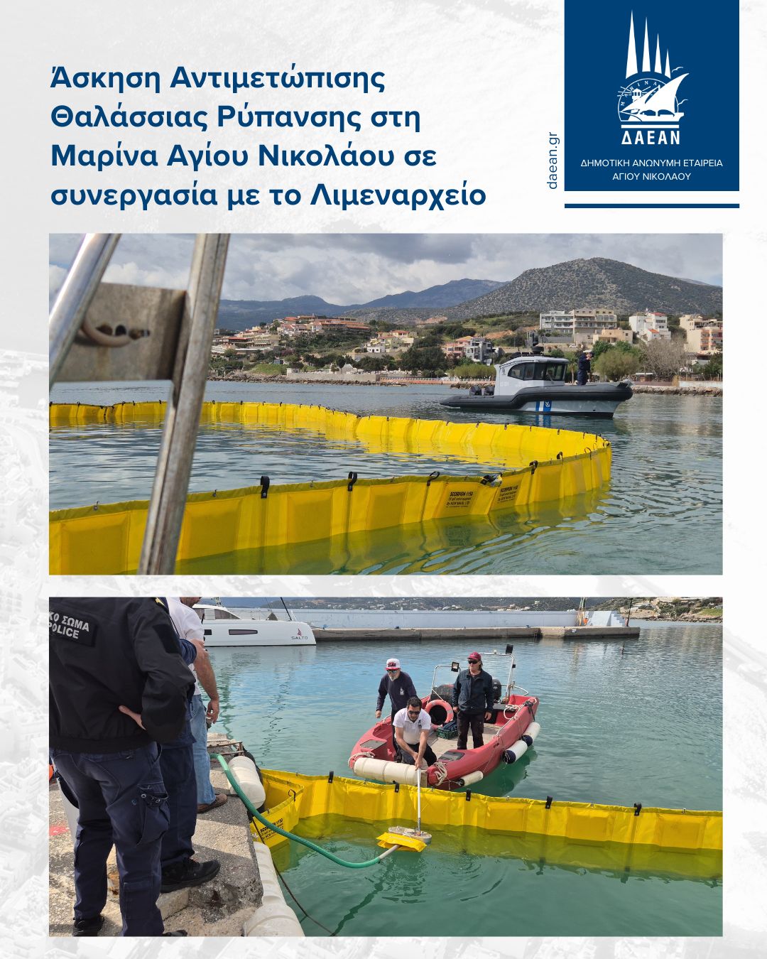 Οργανωμένη άσκηση ετοιμότητας για την αντιμετώπιση περιστατικού θαλάσσιας ρύπανσης πραγματοποιήθηκε, στο πλαίσιο του σχεδίου άσκησης ρύπανσης 2026, στις εγκαταστάσεις της Μαρίνας Αγίου Νικολάου, σε συνεργασία με το Λιμεναρχείο Αγίου Νικολάου και με τη συμμετοχή της Δημοτικής Ανώνυμης Εταιρείας Αγίου Νικολάου (ΔΑΕΑΝ).