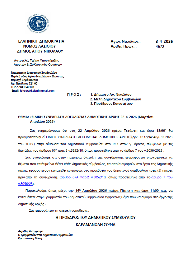 Ενημέρωση για Ειδική Συνεδρίαση Λογοδοσίας Δημοτικής Αρχής 22-4-2026 (Μαρτίου – Απριλίου 2026)
