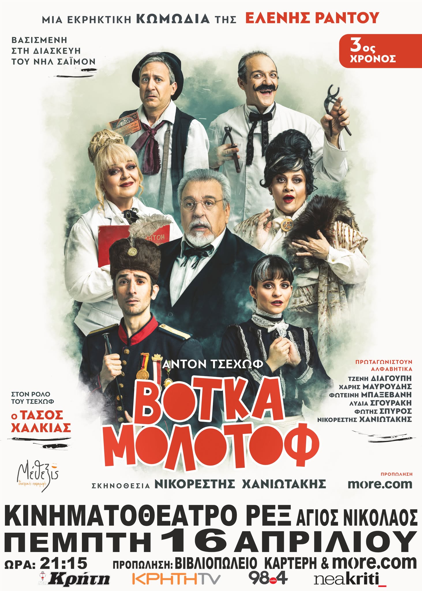 Η μεγάλη θεατρική επιτυχία της Ελένης Ράντου, «Βότκα Μολότοφ», βασισμένη στη διασκευή του Νηλ Σάιμον πάνω σε διηγήματα του Άντον Τσέχωφ, συνεχίζεται για 3η χρονιά και κάνει στάση στον Άγιο Νικόλαο, στο Κινηματοθέατρο ΡΕΞ, την Πέμπτη 16 Απριλίου 2026, στις 21:15.
