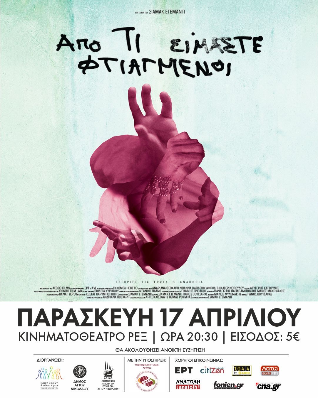 Μια ξεχωριστή κινηματογραφική εμπειρία θα έχουν την ευκαιρία να απολαύσουν οι θεατές την Παρασκευή 17 Απριλίου 2026, στις 20:30, στο Κινηματοθέατρο ΡΕΞ στον Άγιο Νικόλαο, με την ειδική προβολή του ντοκιμαντέρ «Από Τι Είμαστε Φτιαγμένοι» (The Stuff We Are Made Of), παρουσία του Ελληνοϊρανού σκηνοθέτη Σιαμάκ Ετεμάντι και συντελεστών της ταινίας.