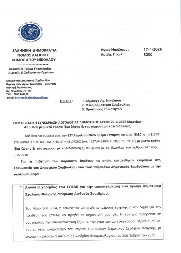 Ειδική Συνεδρίαση Λογοδοσίας Δημοτικής Αρχής. Τετάρτη 22-04-2026 και ώρα 15:30