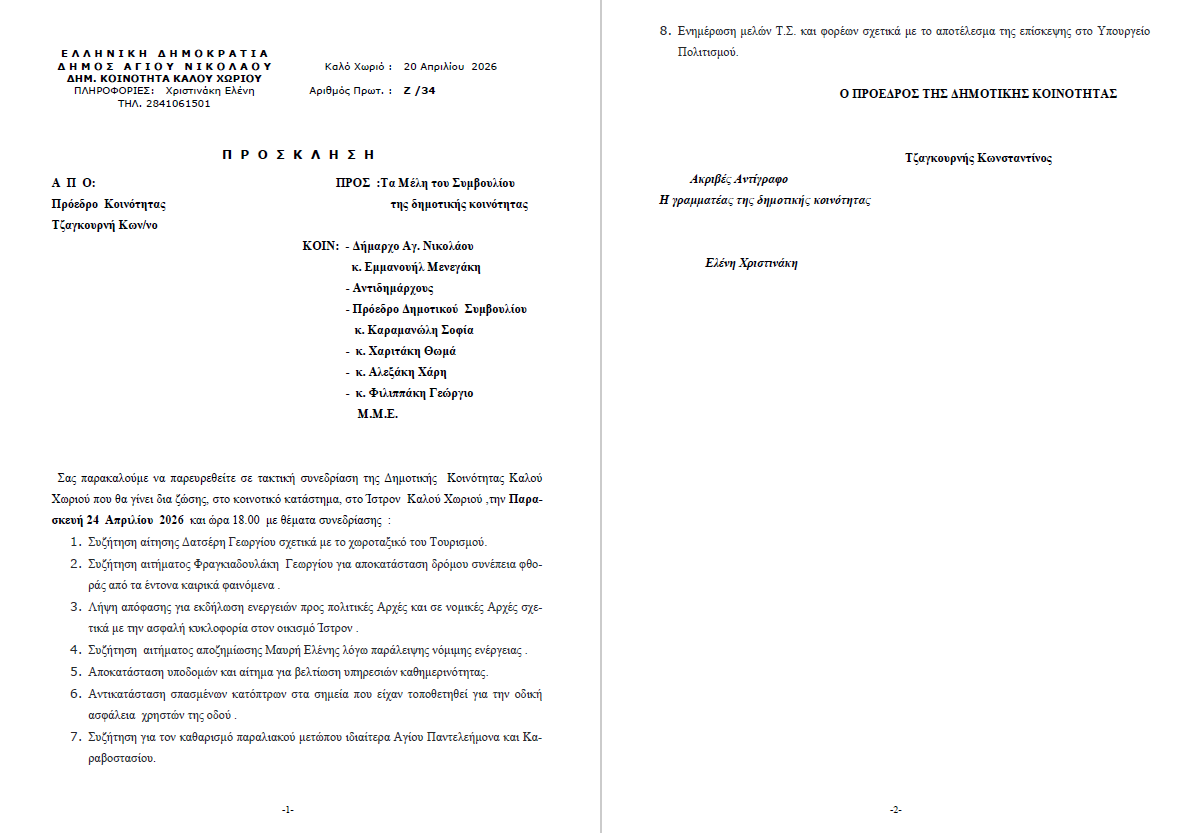 Πρόσκληση για Τακτική Συνεδρίαση της Δημοτικής Κοινότητας Καλού Χωριού. Παρασκευή 24-04-2026 και ώρα 18:00 20 Απριλίου, 2026