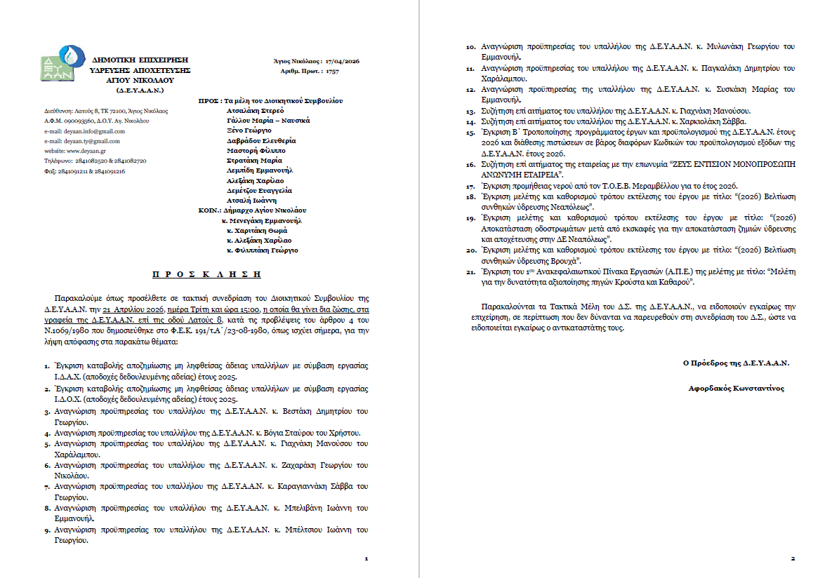 Πρόσκληση Τακτικής Συνεδρίασης Δ.Σ. ΔΕΥΑΑΝ. Τρίτη 21/04/2026 και ώρα 15:00