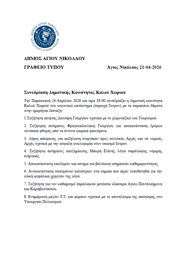 Συνεδρίαση Δημοτικής Κοινότητας Καλού Χωριού. Παρασκευή 24-04-2026 και ώρα 18:00 21 Απριλίου, 2026