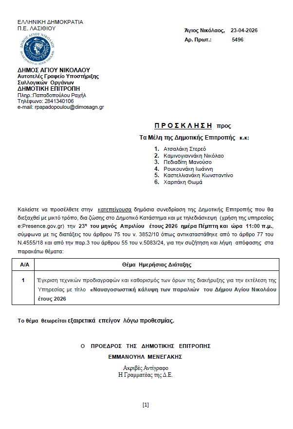 Έκτακτη Συνεδρίαση Δημοτικής Επιτροπής Δήμου Αγίου Νικολάου. Πέμπτη 23-04-2026 και ώρα 11:00 π.μ.