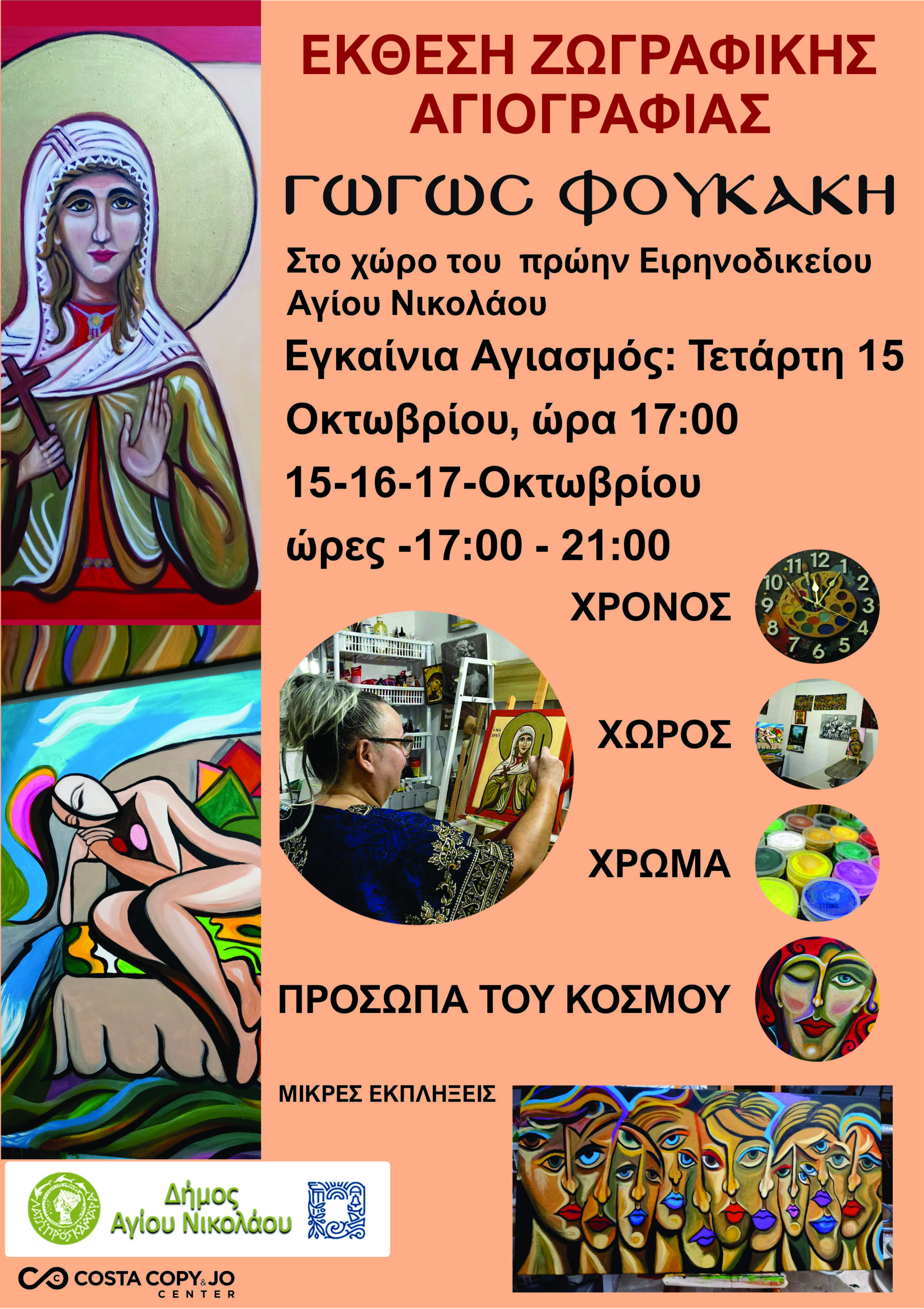 Ο Δήμος Αγίου Νικολάου σας καλεί στα εγκαίνια της έκθεσης ζωγραφικής αγιογραφίας της Γωγώς Φουκάκη με τίτλο : «Χώρος-Χρόνος-Χρώμα-Πρόσωπα του κόσμου» που θα πραγματοποιηθεί την Τετάρτη 15 Οκτωβρίου 2025 στο κτίριο του «Ειρηνοδικείου» Αγίου Νικολάου.