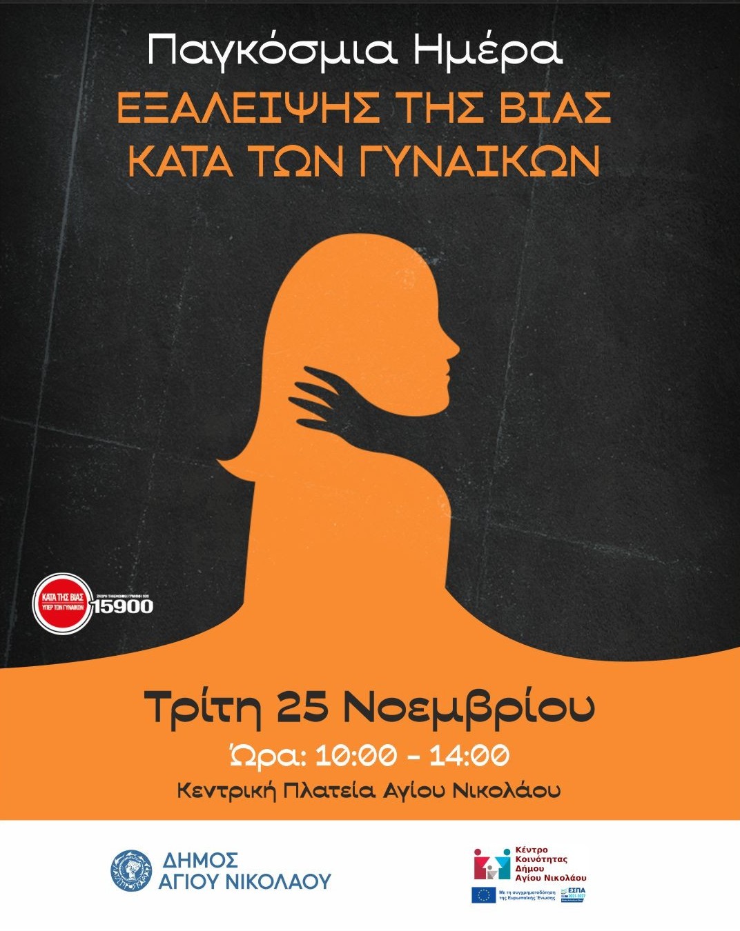 Με αφορμή την Παγκόσμια Ημέρα για την Εξάλειψη της Βίας κατά των Γυναικών (25 Νοεμβρίου), το Τμήμα Κοινωνικής Προστασίας και Παιδείας και το Κέντρο Κοινότητας Δήμου Αγίου Νικολάου διοργανώνουν δράσεις ενημέρωσης και ευαισθητοποίησης του κοινού στις 21-24-25/11 & 3-4/12/ 2025.