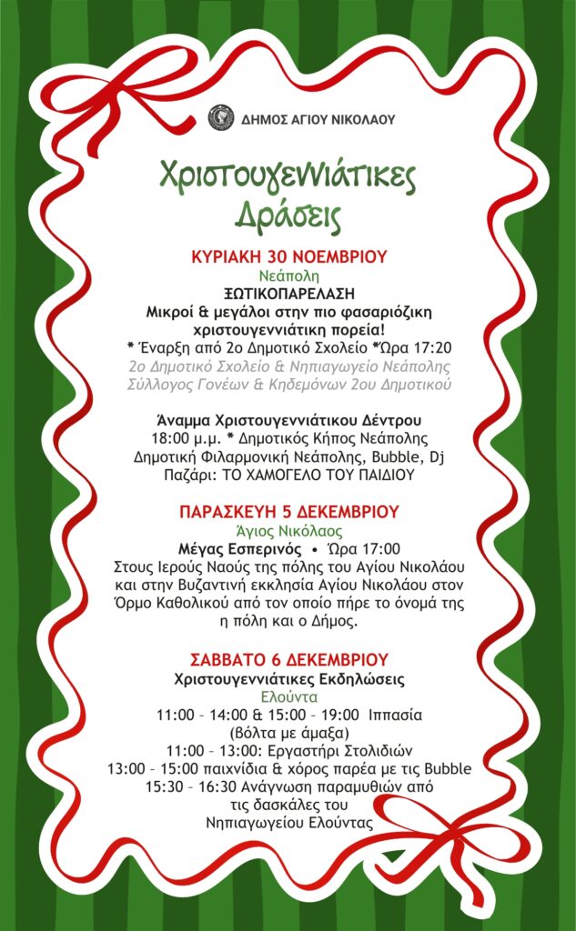 Δείτε ανά πάσα στιγμή οποιαδήποτε εκδήλωση οργανώνεται στο Δήμο Αγίου Νικολάου από τον Δήμο ή ιδιώτες στα πλαίσια του Νομού μας.